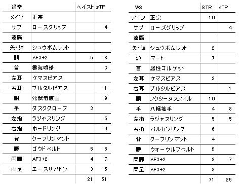これで通常命中482、WS命中513(※属性ゴルゲ含まず)